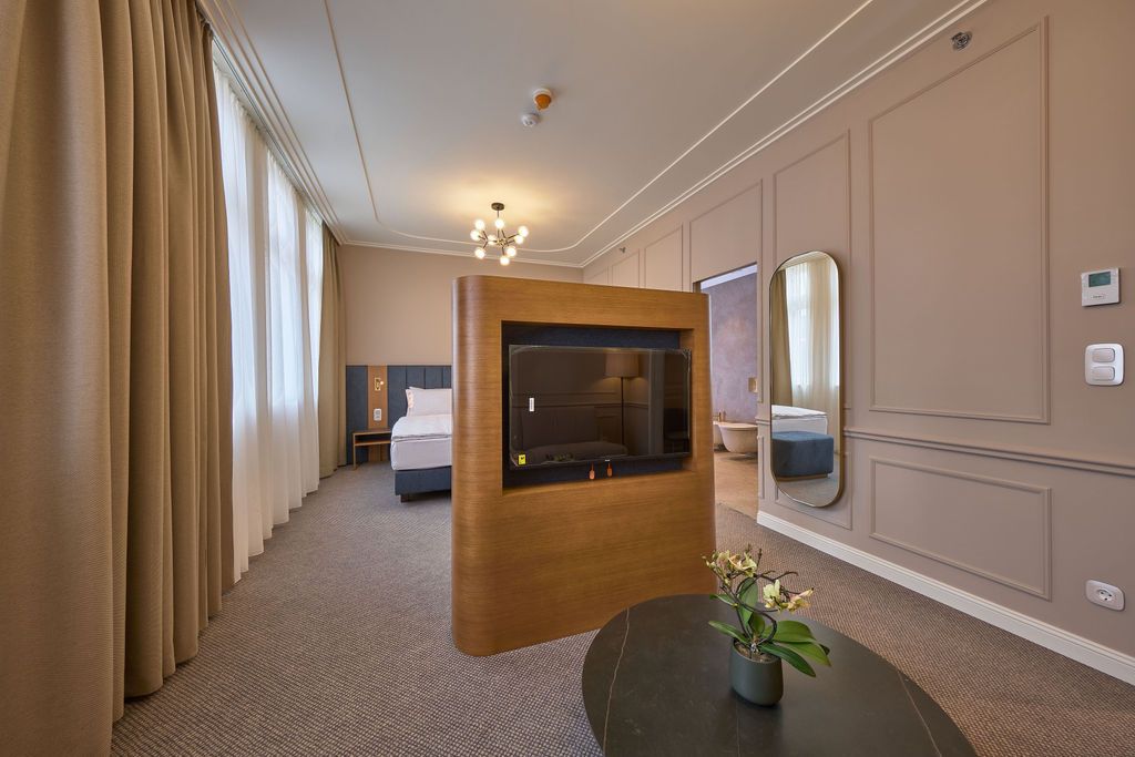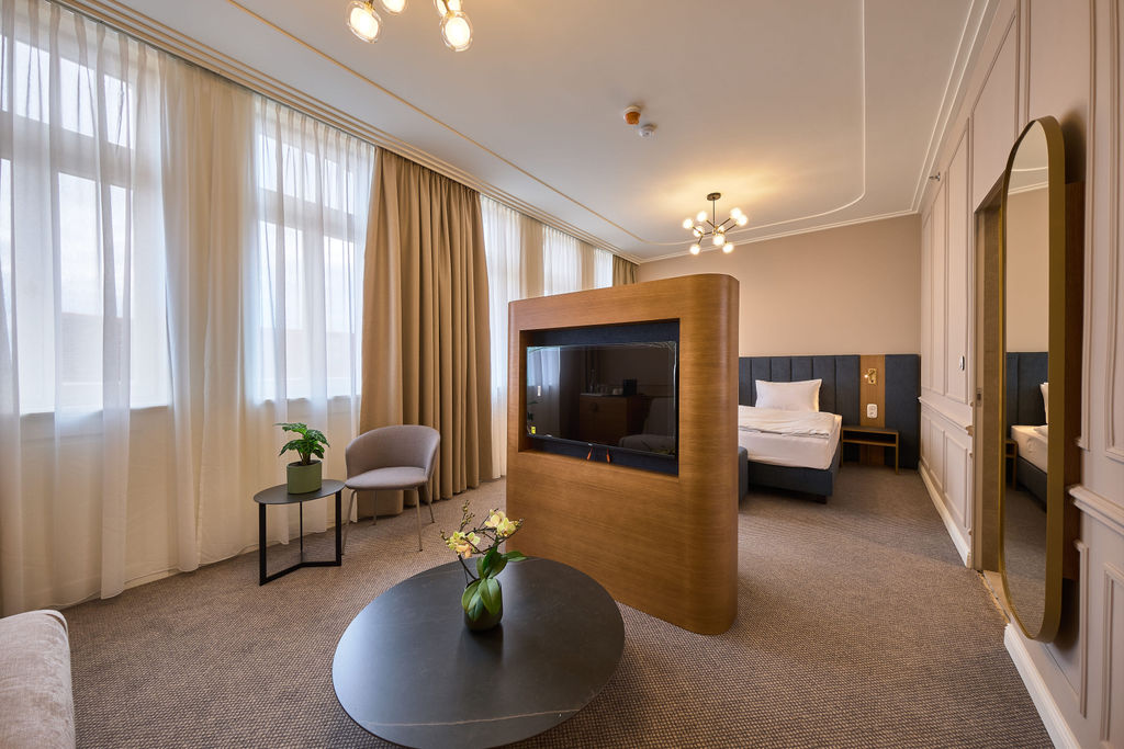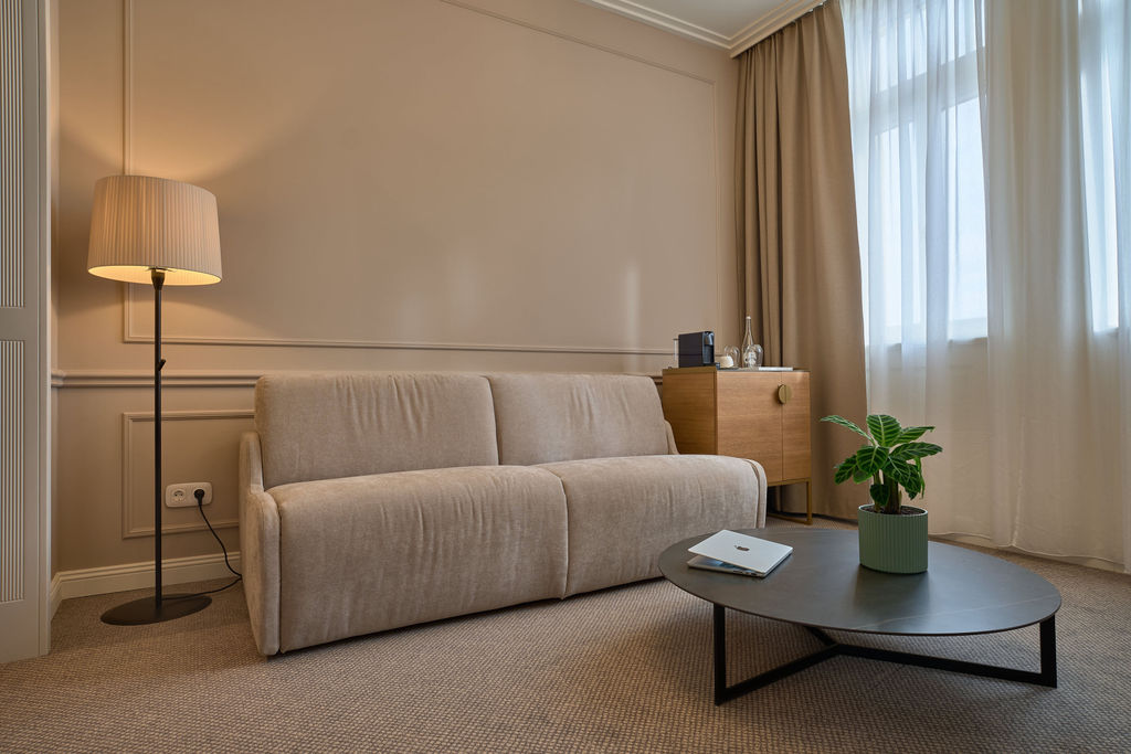 A Junior Suite tágas, nappali sarokkal rendelkező elrendezése luxus kényelmet nyújt. A kifogástalan alvásélményt egy king-size ágy biztosítja, prémium minőségű matraccal.